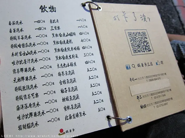 菜單最後刊上了瞞著爹系列的分店資料,還有個大大的QR code供人方便找到fb粉絲團,感覺現在不少店家都相當注重網路行銷這塊,想透過打卡之類的方式提高曝光率。