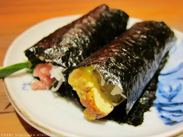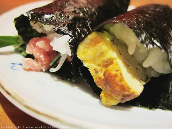 和朋友點了手捲來嚐鮮,是圓筒形的外觀且有放入米飯,我點了個人愛好的玉子燒手捲,可惜瞞著爹的玉子燒不怎麼出色,不會讓人想再三回味,加上份量不少的米飯以後蠻容易有飽足感,以價格而言倒是覺得可以接受。
