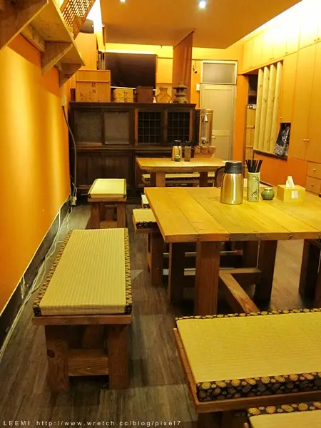 結完帳後就等著服務人員帶位,感覺一樓的動線有點狹窄座位也有些擁擠,我們則是被帶到二樓的角落,座位是比較寬敞的方桌,桌子本身是採木條拼接而成的且間隙有點大,感覺清理上會比較費力。開始收取服務費,也就是等同於漲價的現在,反而已經沒有供應免費的味噌湯了,桌上保溫瓶內改以熱茶代替,後來看到隔壁桌客人的餐點內容才知道味噌湯改用單點的方式,不過菜單上沒瞧見服務人員也不曾告知,不知這家店是否屬於熟客限定?