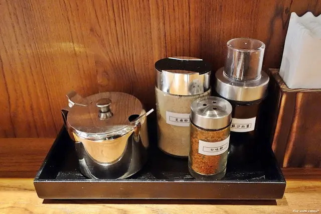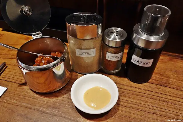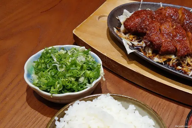 每道豬排都是味噌口味,吃起來難免覺得有些單調,於是搭配的變化就變得很重要,有幾個推薦的吃法,像是日式炸豬排的好搭檔黃芥末在此也可發揮功效,微微的嗆感和醬汁原有的甘甜起了微妙的調和作用,而在豬排上灑滿大量蔥花的吃法也是有意思,辛香爽脆的豪快中又多了點爽口,值得一試,黃芥末可以免費向店家索取,蔥花則是一份30元,如果不是蔥花狂熱者,大概兩三人分享都還很夠,芝麻粉和七味粉效果比較一般,菜單上另外一款這次沒點來試的加價配料美乃滋,每份是15元,讓人有些好奇若是那種不甜的日式美乃滋,和味噌豬排配起來又是哪種風味。
