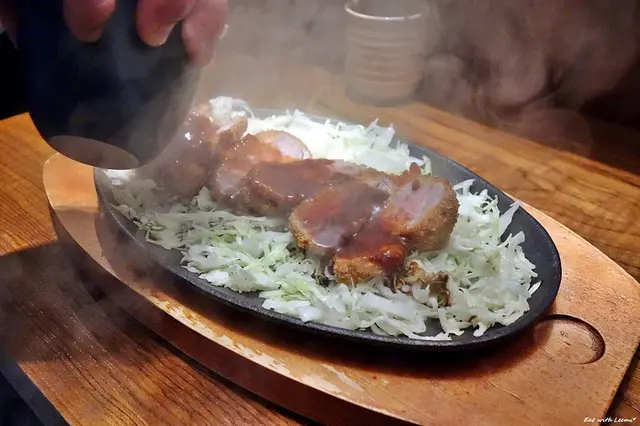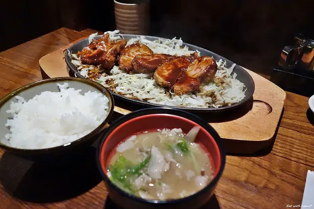 光就豬肉來說是腰內比里肌好吃,尤其我們點的那份鐵板味噌腰內豬排熟度控制的很好,上桌時切面的色澤模樣讓人信心大增,希望不是因為開幕初期由日籍廚師掌廚才有的曇花一現,但在搭配味噌醬的吃法之下,個人則比較喜歡里肌,主要還是肉本身部位差異所致,腰內的柔軟配這種較強的調味,存在感就被壓下去了,原本肉質細緻無油的優點能表現的有限。至於里肌的部分,在這裡吃到最喜歡的則非極上厚切里肌豬排莫屬,里肌肉原本就較有口感,這款雖更強調了厚度,但並不會過硬,加上濃香的味噌醬倒是襯托得宜,吃到邊緣有點肥油的地方個人接受度也不錯,只是文宣上所說厚度加倍稍微讓人覺得有點誇大,而鐵板味噌里肌豬排則是另一道引人注目的料理,加熱過的鐵板,一層高麗菜絲墊底擺上切塊的豬排,淋上味噌醬時因接觸到高溫,多了一丁點微妙的焦香,相當誘人,只是高麗菜絲出水後反而稀釋了醬汁的鹹度,已經習慣原本的濃度時則覺得有一點不夠味了,至於特大里肌豬排看似豪氣,寬廣的面積底下其實稍欠厚度,口感上單薄不少,若要說有什麼優勢,大概是選擇豬排醬與味噌醬的雙醬搭配,可以讓整體比較不無聊吧。