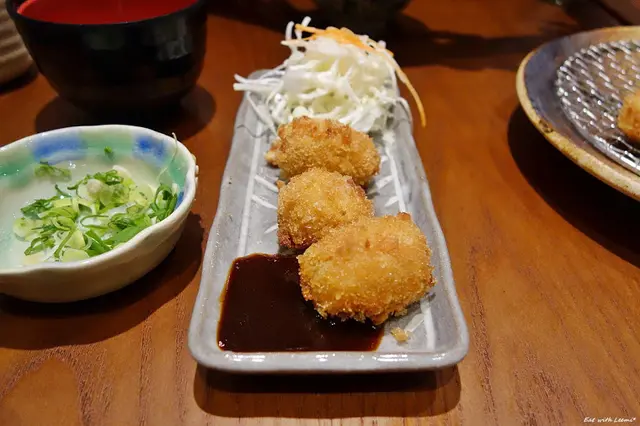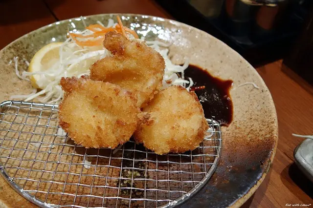 單點的蟹肉可樂餅也好吃,脆脆的外層之下奶油餡料綿密濃厚,第一口的滿足感相當高,但也膩得很快,連帶主食也是口味重的類型,蟹肉可樂餅一人一個對我而言已是極限,只能笑自己一開始點菜沒看清楚原來還有迷你版,第二次學聰明了,想試個口味便點個迷你可樂餅來分著吃就好,這次還多點了一款北海道干貝,賣相不是那麼吸引人,而且也不像過去曾吃到整顆炸干貝的那種厚度,不過大夥對這道菜的評價並不會太糟,因為只淋點檸檬汁的干貝是在整桌之中覺得最接近清爽原味的食物。