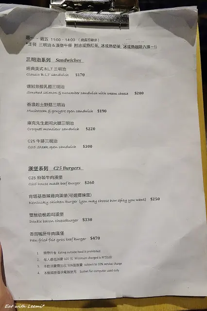 除了各式飲品外也提供不少正餐的選項,白天還另有早午餐的菜單,每人低消100元,加收10%服務費,另外不得不說這點菜本的形式看來有點太隨意了。