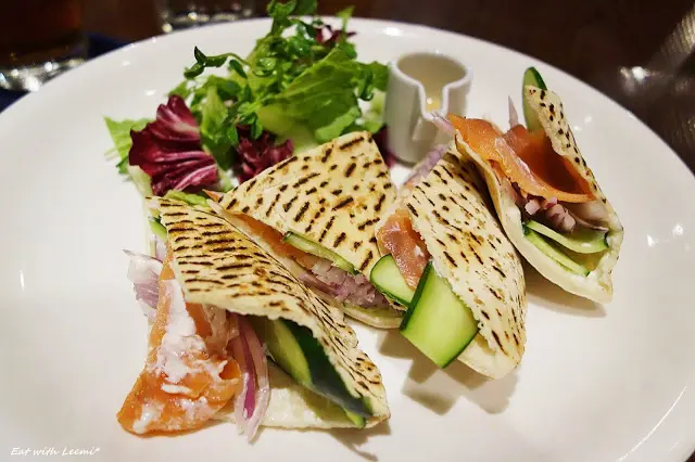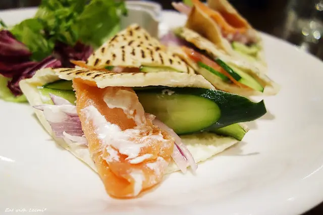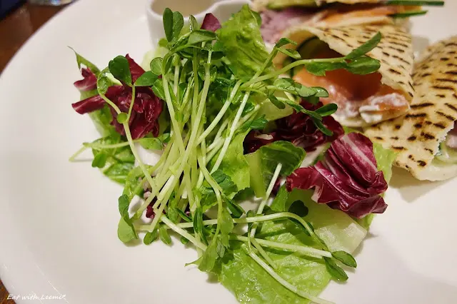 C25並不是每款三明治都用相同的麵包,像這款燻鮭魚酸乳酪用的就是烙烤過的袋餅,夾上燻鮭魚、酸乳酪、洋蔥和黃瓜,鮭魚片份量不少放的也均勻,不會有到邊邊角角沒吃到的窘境,抹上酸乳酪增味,奶香濃同時又是非常清爽的一品,另外加了生洋蔥這點我個人很愛,沙拉配的是油醋醬,菜葉也算新鮮,不過整體份量有點少,是吃完還真沒什麼飽足感的輕食路線。