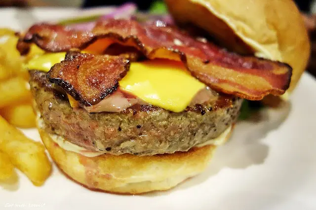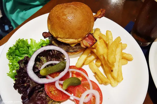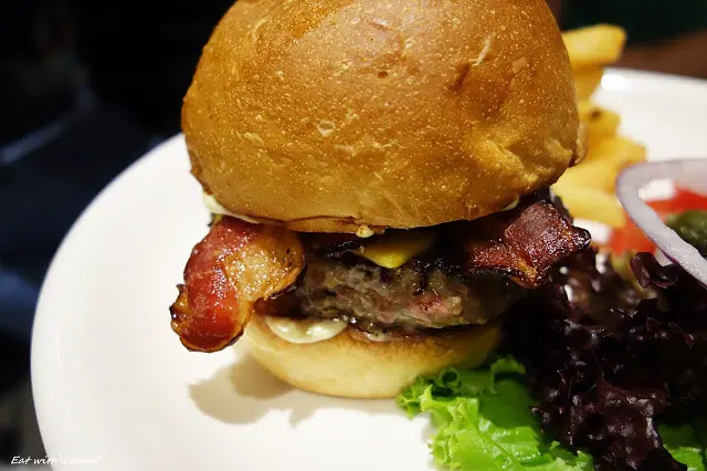雖然這裡是咖啡館,不過供應的漢堡倒是讓人出乎意料,烤脆的麵包與起司、香脆培根加上多汁漢堡肉呈現經典組合,漢堡肉較厚,而且是內裡還帶點粉的熟度,吃起來相當多汁,獲得我們一致好評。