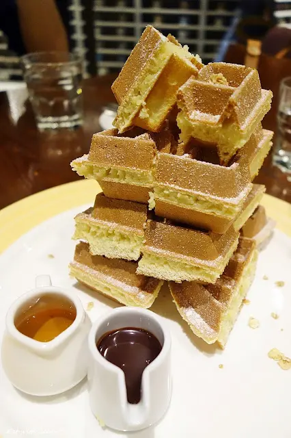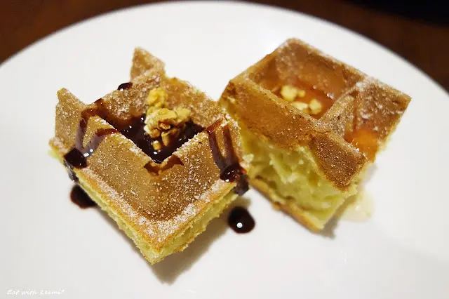 上頭灑了些核果碎,整體份量還不錯,把圓鬆餅切小塊堆疊的視覺效果看起來有加分,只是味道口感比較一般,搭配的醬料也都是基本款,就單純當作有個餐後甜點吃這樣。
