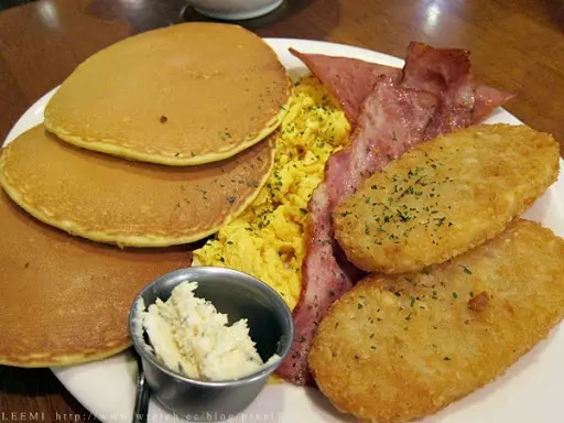 三塊鬆餅+炒蛋+火腿+培根還有兩塊薯餅的罪惡組合,另外附上淋鬆餅糖漿,這盤算是高熱量的豐盛組合,白色的義大利香料起司醬是偏鹹的調味,搭起來還不錯。