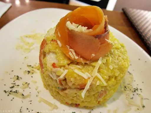 飯麵系列皆為主餐單品,選套餐需加價,所以光這盤280元+10%個人覺得有點不划算,飯少了點份量不是很滿意,奶油醬汁夠濃郁但不會讓人易生膩,調味確實不錯,鮭魚份量太少搭配起來稍嫌不過癮。
