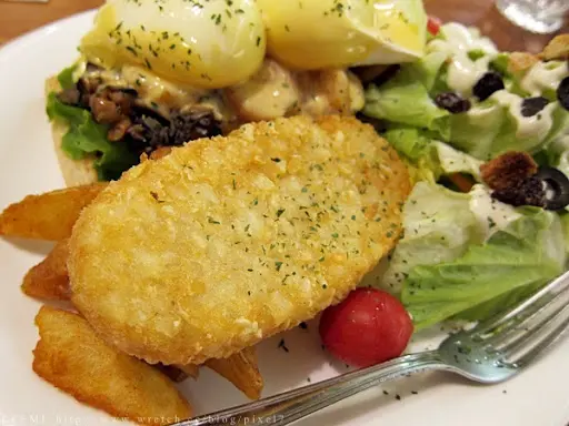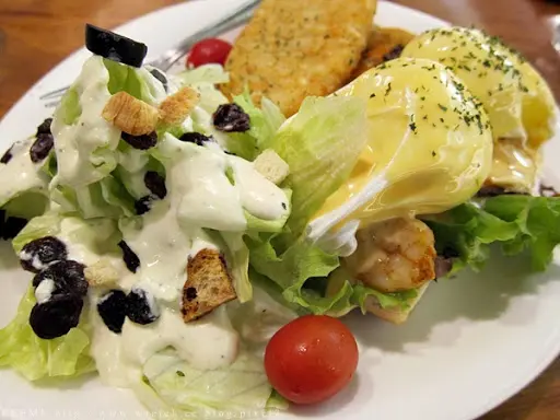 貳樓當然少不了這道可稱上是早午餐招牌之一的班尼迪克蛋,光口味就有三種選擇,這回點了紐澳辣鮮蝦口味,自選三選一的配餐則挑了沙拉搭配凱薩醬,一上桌果真讓人驚艷,堆滿滿的豐盛擺盤讓人食指大動,除了主餐班尼蛋以外還有炸的金黃的薯餅和薯條,配上自選沙拉,誠然是營養與熱量兼具的模樣。
