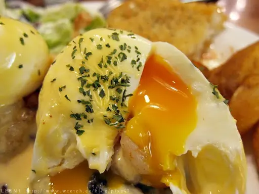 中心半熟的水波蛋淋上由蛋黃和奶油調製成的荷蘭醬,真是超誘人又超罪惡的料理,被壓著的辣鮮蝦微辣偏重口味相當討喜,在配上炒菇與最底下的雜糧麵包層層組合,將水波蛋破開蛋黃隨即流洩而出,各人偏愛切下一小塊麵包後堆上炒菇+鮮蝦+蛋白,在沾裹上厚厚一層蛋黃+荷蘭醬一起送入口中,各種滋味交疊在一起相當過癮,雖然食材不是說超了不起,但這種作法本身就已經先犯規了XD。