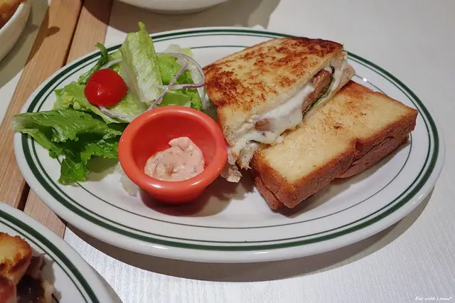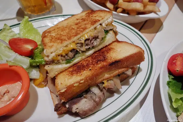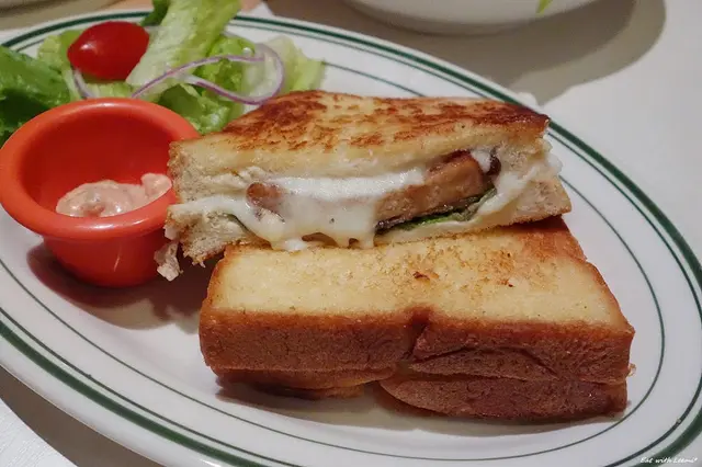 吐司金黃略帶焦紋模樣還挺誘人,實際品嘗覺得沒什麼酥脆感,而且邊緣較厚的部分口感明顯偏乾,而且整體油味有點重不是太愛,炸排骨有厚度,但本身調味比預期中的台式口味清淡不少,也缺少炸物的香氣,因壓烤的緣故生菜有點軟爛,豐厚的起司算有彌補一些口感回來。