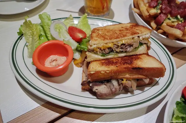 餡料的牛肉片和菇類口感都偏乾,還好有九層塔增添些微氣味,和切達起司也算合拍,吐司的部分一樣不是很愛,自認平常算是口味較重且對於油膩食物接受度也很高的人,不過這裡乳酪三明治真的剛好沒有很合口味,口感吃起來既厚重又油膩,食物本身及調味特色卻又單薄到讓人無法感受,相當微妙。