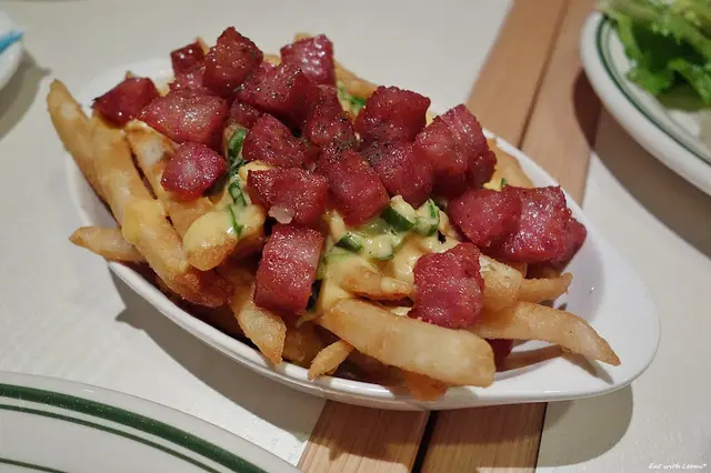 這道薯條是我們當日比較喜愛的菜色,台式香腸和蒜苗本來就合拍,沒想到加上起司和薯條其實也算搭,甜鹹香吃來還頗對味,可惜香腸丁略油一些,加上降溫後起司乾黏薯條易碎口感大打折扣,上桌趁熱快享用才是最佳風味。