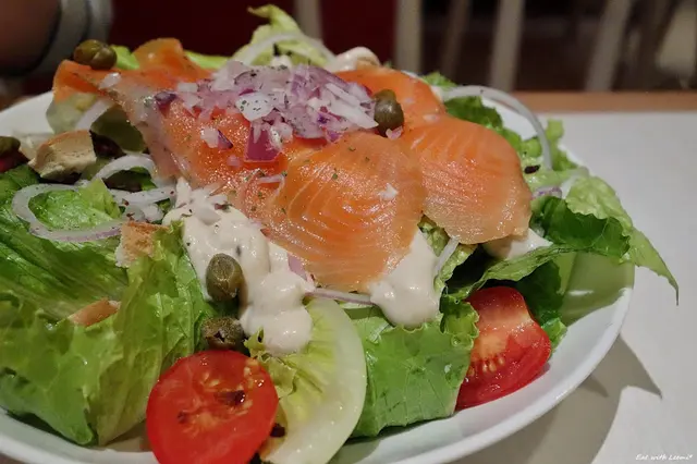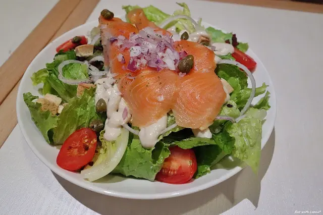 這道算是偏安全牌的菜色,醬汁給得多味道夠有一點偏濃膩,燻鮭魚口感一般,配紫洋蔥和酸豆還算搭,但沾到沙拉醬的部分則會被搶去不少味道,有一小部分菜葉有點流失水份,吃起來口感比較不是那麼新鮮。
