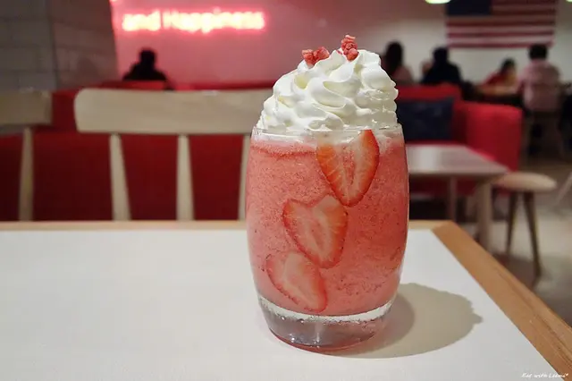 外表搶眼可愛的飲料,尤其切成薄片排列在杯壁上的草莓片就像一串愛心模樣相當討喜,至於味道則是相對沒那麼出色,草莓風味調合感重,口感也不是那麼滑順的類型,冰晶顆粒較為明顯。