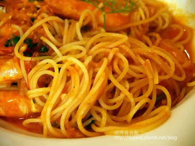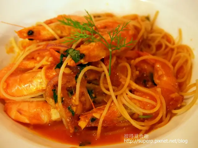 茄汁鮮蝦細直麵$360(蝦子的份量很多。茄汁也鮮美。只是如果是細扁麵我會更喜歡,推!)