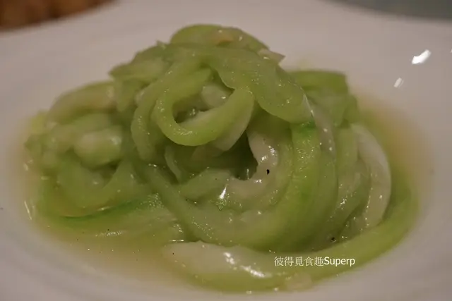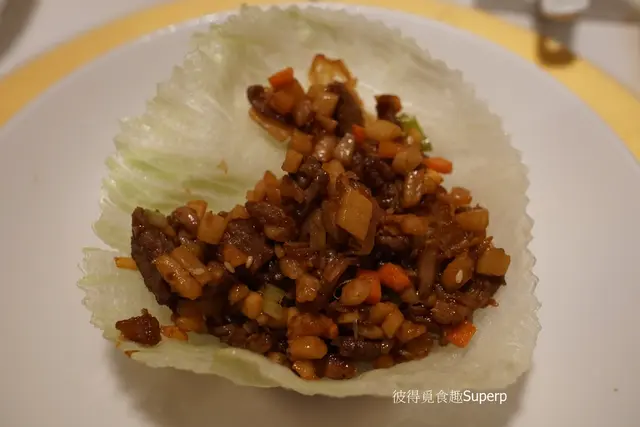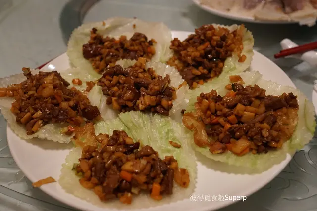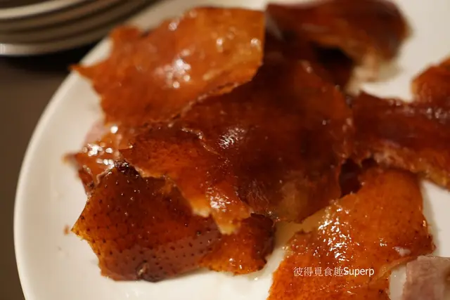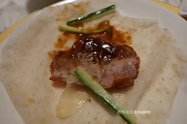 餅皮Q彈。鴨皮酥脆鮮美。裡面除了加小黃瓜絲跟甜麵醬這兩個常見的組合以外,還少見的搭配了嫩薑片。個人跟同行大部份的友人都不覺得加嫩薑片有很契合,吃起來有點悶悶的,可惜了。由於是兩隻比較大的鴨,鴨餅的數量極多,9個人竟然到最後吃不太完。我們發現裡面有嫩薑時,服務員已經包完了。如果少了這嫩薑片,這片皮鴨是大推。