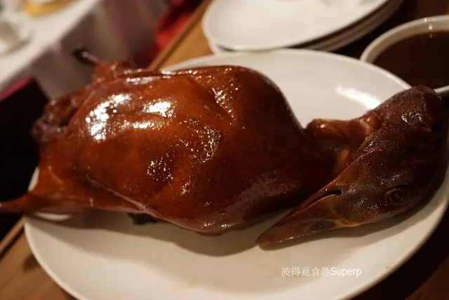烤鴨三吃之片皮鴨$2,000(我們九個人,怕一隻吃不過癮,點了兩隻。這鴨的個頭感覺比外面一般的烤鴨大一些。鴨皮呈現棗紅色,肥腴無比。師傅現場片鴨,服務員會包好鴨餅後送上來。)