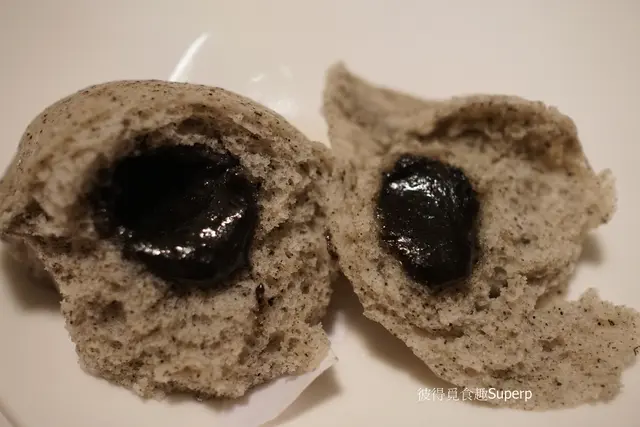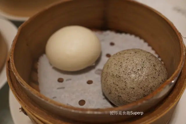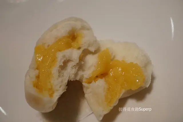 鴛鴦流沙包$100(是奶黃流沙包跟芝麻流沙包。上菜時讓我的期待頗高,不過發覺他們皮有點厚,而內餡比例不高,所以沒有想像中的爆漿。而且奶黃流沙包裡面的鹹蛋可能加不夠多,還是無法跟吉品海鮮或喆園的相比。君品酒店的頤宮賣的芝麻流沙包也比較有流沙效果。)
