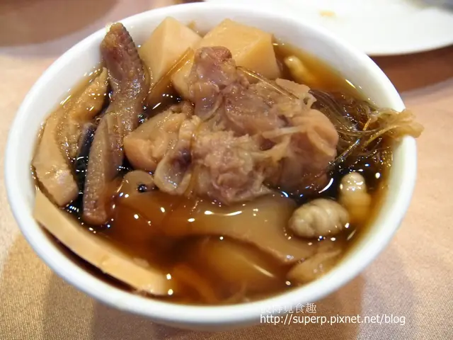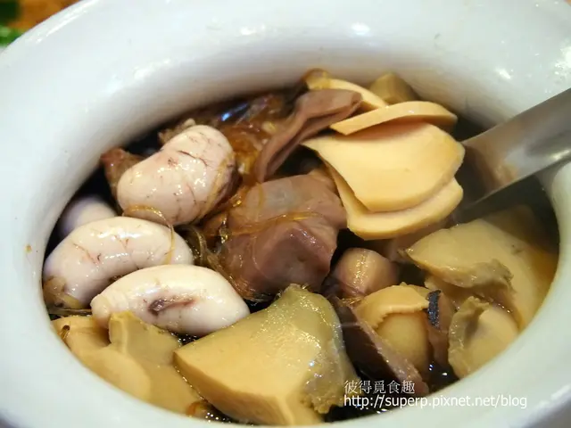 佛跳牆中份$5500(需預訂。湯頭清澈鮮美,完全不像一般的渾濁。裡面有雞睾丸,魚翅,鮑魚,豬腳,荸薺,筍子,香菇…等等的料。味道層次分明不膩口,真是喝過最棒的佛跳牆。只是價格太高不可攀了。大推!)