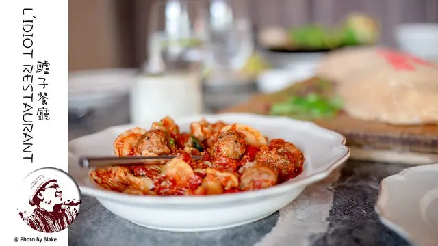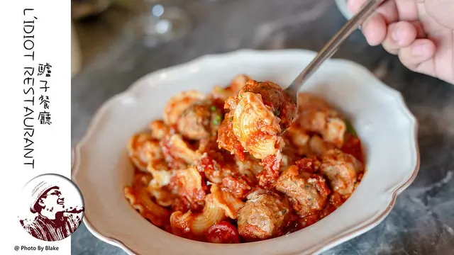主食是提供義式茄汁手工豬肉丸雞冠麵,由主廚自製的義式雞冠麵,雞冠麵像是通心麵跟蝴蝶麵的結合,再搭配手打的豬肉丸,義式茄汁讓整盤麵看起來紅通通的,雞冠麵吃起來麵粉感,口感蠻Q的,茄汁的味道很濃郁,帶有蕃茄微微的酸甜感,但整體來說味道會偏鹹一些些,手打豬肉丸還算扎實。