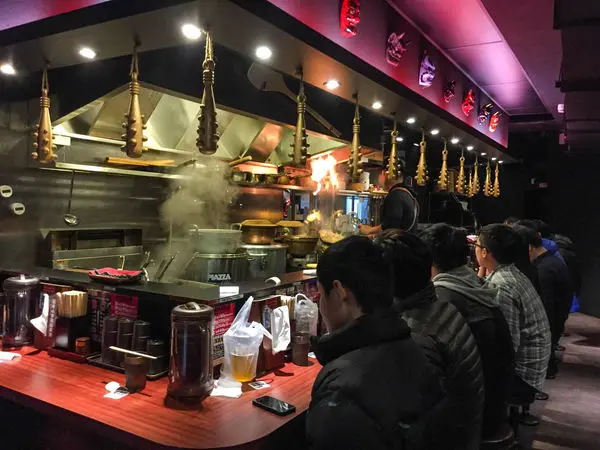 時間一到麵友們魚貫入座,在等出餐之前一起看老大帥氣地使用炒鍋炒配料,說真的憑這兩下功夫