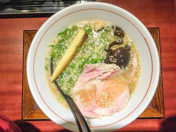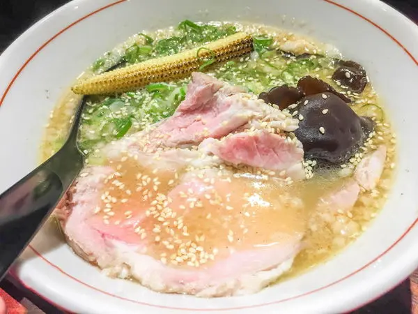 超軟綿的伊比利豬叉燒、大量的蔥花、必備的玉米筍、川耳(小朵一點的黑木耳)跟湯裡的白芝麻與背脂海,