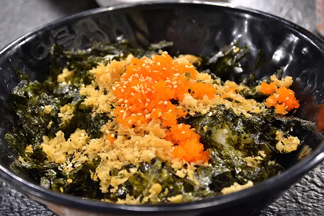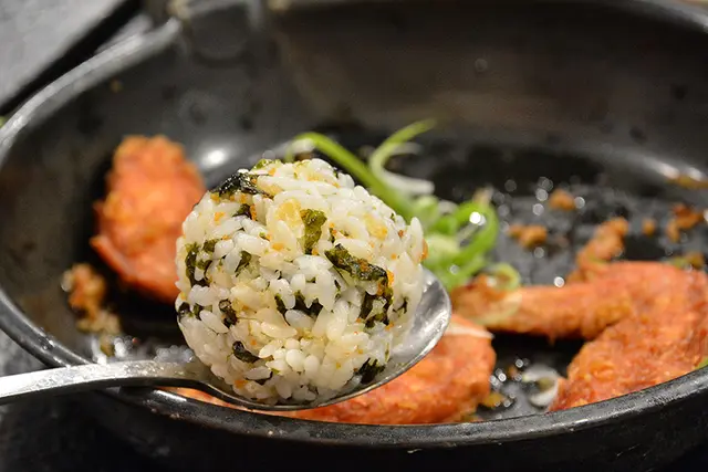大約一個大型貢丸的尺寸,米粒有點黏嫩潤感,可吃到酥脆的炸麵麩,帶點麻油香氣。