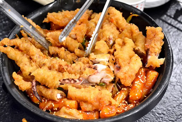 魷魚外皮超級硬脆很有嚼勁及彈性,沾上起司年糕醬汁,味道可以很持久,