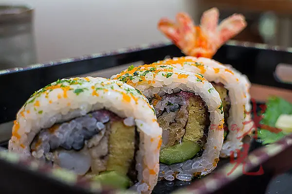 愛吃花壽司的米兒,自然不能錯過用這個了,同樣包進鹿兒島明蝦的花壽司,裡頭料很多喔~~醋飯的酸度甜度和蝦肉搭配得非常好~~