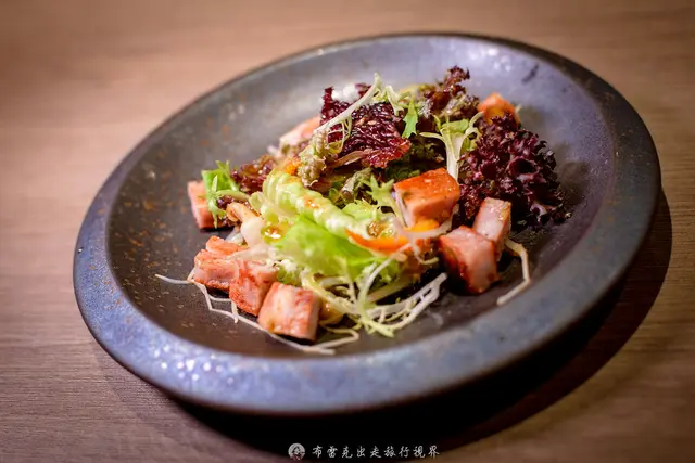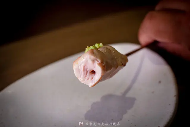 雞生蠔也有人稱為雞牡蠣,雞生蠔是雞腿根部,從雞腿分切出來的,而且刀工必須純熟俐落,一隻雞都只會有兩個,,口感非常細緻柔滑,完全沒有纖維感,咬下去肉汁飽滿,有用上青花椒,吃起來會有微微的刺激感,然後又配上蛋黃醬,尾韻更為柔順,真的超厲害的,只是只有一個,讓人意猶未盡。