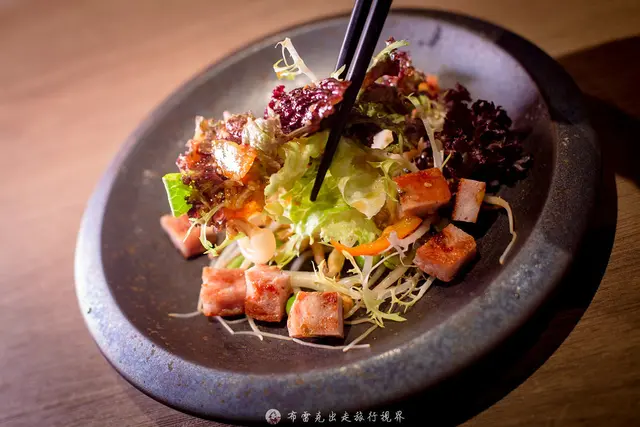 採用苗栗小農栽種的黑豆苗、花生芽苗當底,然後再加上許多生菜,放上雞肉火腿,因為有加了金桔醬與白蘭地,吃起來的香氣很足,吃起來挺鮮的,也相當開胃。