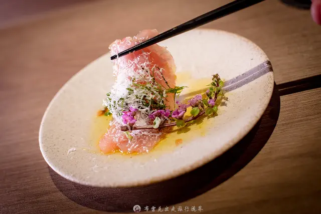 昆布漬雞胸肉真的是吃生雞肉,原則上就是用昆布醃漬的雞肉刺身,然後再淋上山西陳醋與橄欖油,吃之前可以把紫蘇花撥下去,一入口整個味道相當複雜,卻不會互相衝突,然後桂丁雞雞肉刺身入口相當滑嫩。
