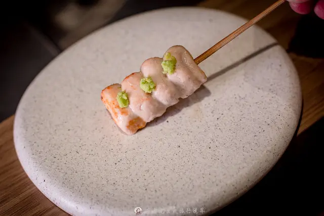 《鳥哲 燒物專門店》招牌就是烤到半生熟的山葵雞里肌,用的是可以生吃的桂丁雞,然後烤到約末7~8分的熟度,再加上現磨的山葵,入口很妙,外面帶有微微焦香跟里肌肉本身的微酸感,然後內裡卻是相當鮮嫩,搭配山葵之後吃起來典雅,整個很妙。