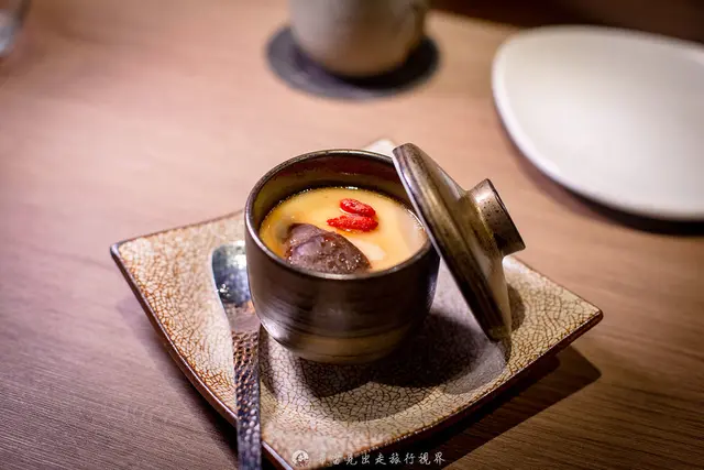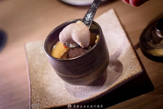 古式茶碗蒸一打開有一種麻油雞酒的感覺,是用嘉義古式麻油煸炒老薑,然後用炒出來哦麻油來做茶碗蒸,吃起來香氣十足,茶碗蒸裡面還有雞白子、香菇與銀杏,感覺上真的很補。