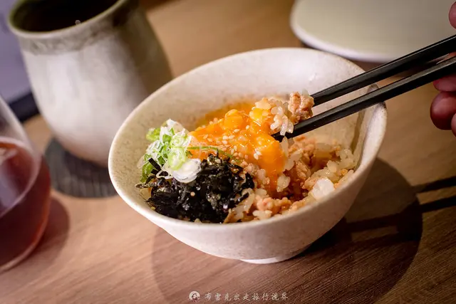 用台酒30年陳年花雕酒與台東關山米做成的陳年花雕雞鬆釜飯,一開鍋就能聞得到花雕酒酒香,上面還放了顆桂丁雞的蛋黃,蛋白的部份則是去做了雞豆腐,要吃之前一定要先拌勻,用雞肉做成的雞肉鬆,有一點像是瘦肉燥,帶有一點鹹香,生蛋黃下去之後,味道更為濃郁。