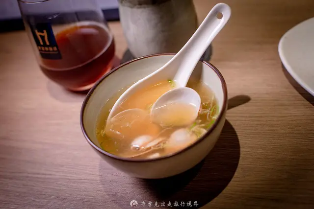 蒜頭雞湯真的是暖胃湯品,一入口真的很甘甜,帶有蛤蜊的鮮甜,相當的溫潤,雞肉也是桂丁雞,吃起來也是相當嫩口,最特別的是還是用桂丁雞蛋白製作的魚豆腐,咬起來相當有空氣感。
