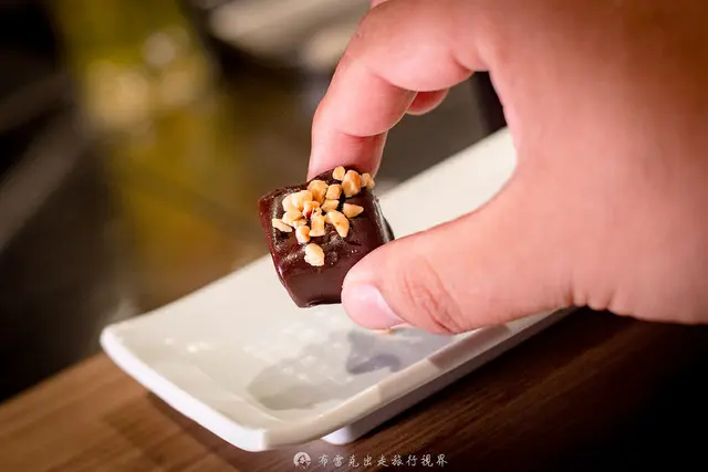 巧克力慕斯看似一般巧克力,但實則是用73%比利時巧克力去包覆與洋蔥炒過做成的雞肝慕斯,對的! 裡面包著雞肝,神奇吧!但作為一家燒鳥串燒店來說,以雞肝巧克力作為結尾,也是個很妙的呼應,咬下去甜苦的味道帶有雞肝味道,帶有略淡的鹹香,好吃又有層次感。