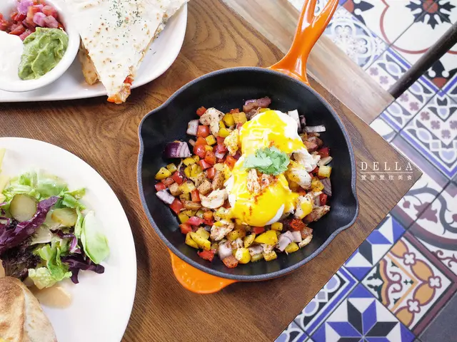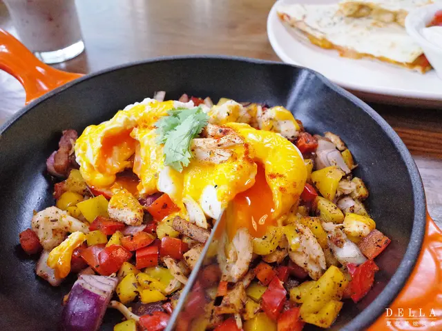 經典的鐵鍋早餐,除了主角蟹肉,還加入甜椒、洋蔥和香料一起拌炒,上頭打上兩顆半熟蛋