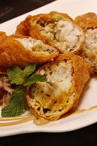 其二是:蟹甲捲心酥、紅燒蟹肉翅、清蒸大閘蟹一隻、蟹黃燴魚肚、蟹黃小籠包、四季水果盤;每人4,800大洋,附贈老薑茶。