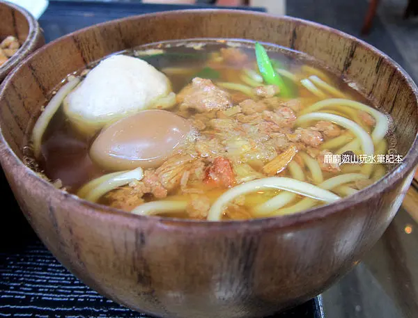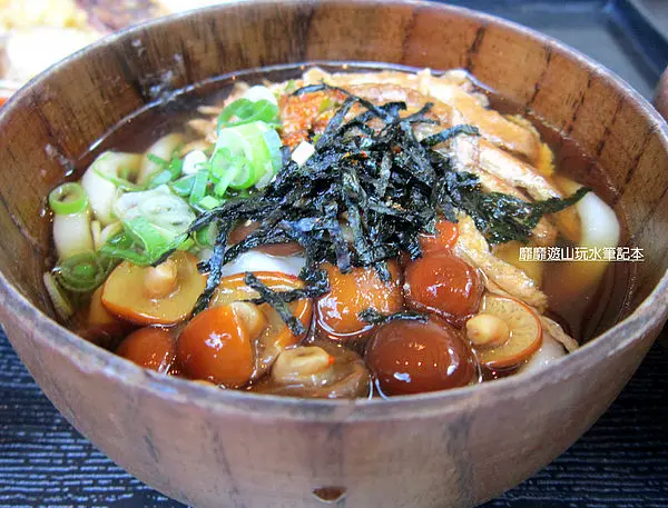 裡面有甜甜的豆皮絲、小小菇、蔥花、海苔絲、七味粉,很好吃,烏龍麵算Q~