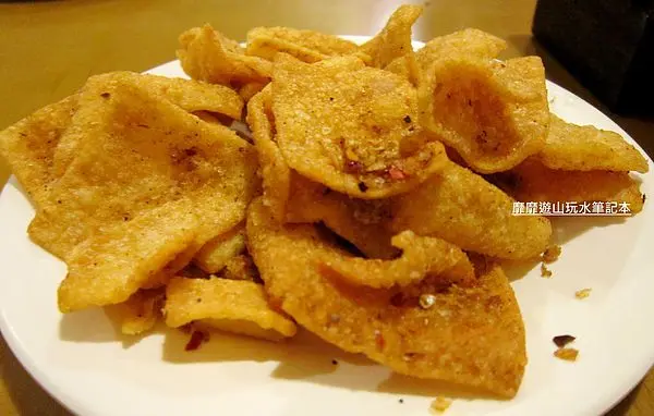 炸的酥脆的不知道是不是豬皮的東西很香,配料用的是辣椒跟胡椒粉之類的,我比較喜歡吃!
