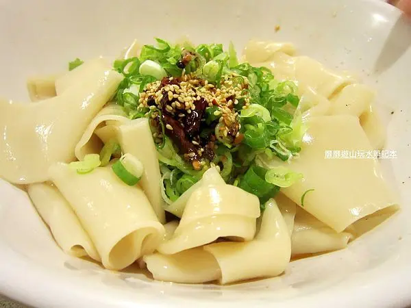 這麵兒又叫腰帶麵,是陝西的家常乾麵,寬寬的很有彈性又Q,跟蔥花和醬汁一起拌勻了很香很好吃,不過一個人差不多都只能分到一片嘗鮮~