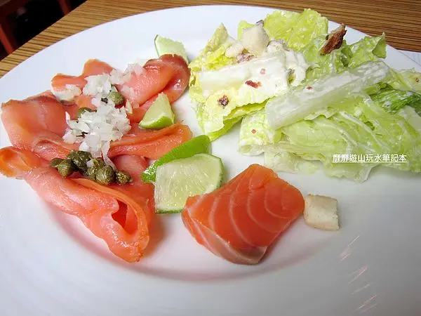哈哈哈哈~又來一盤燻鮭魚啦,搭配凱薩沙拉!