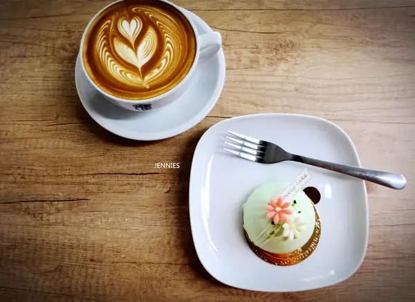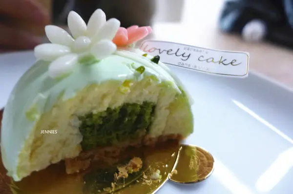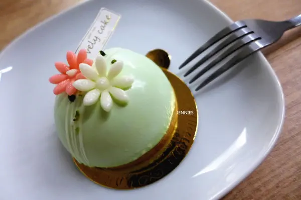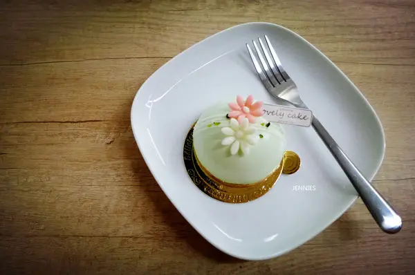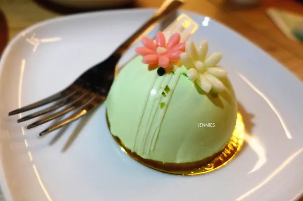 點了造型可愛的沐夏柚花,材料是茶鳩康地蛋糕 靜岡抹茶甘納許 香柚慕絲及檸檬塔皮。綠色的蛋糕體讓視覺有著無限的想像加乘,兩朵可愛的小花輕綴其上,雅緻又溫柔的色調馬上就擄獲了我的心。