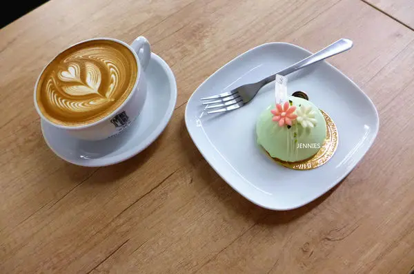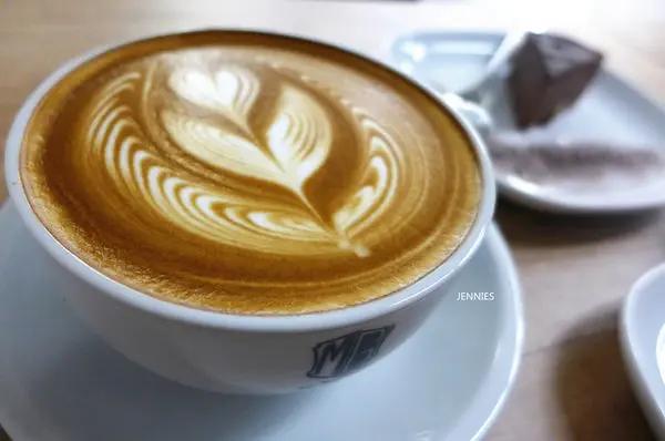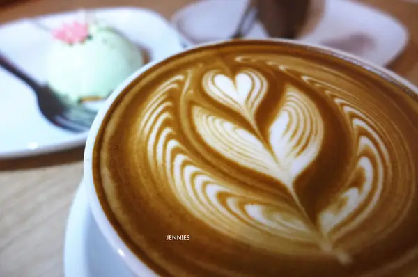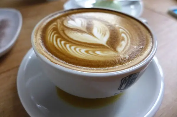 然後點了拿鐵,哇!這拉花也太精緻了吧!不知怎麼看拉花厲不厲害,但這杯咖啡有十圈以上的花紋耶!覺得手要很穩。