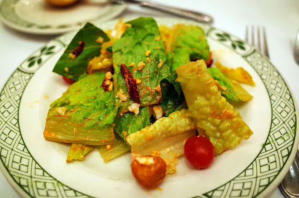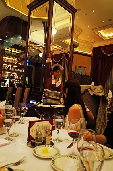 輕轉沙拉缽後,服務人員會將手高高舉起,將特殊的葡萄酒沙拉醬淋至旋轉的沙拉缽裡。