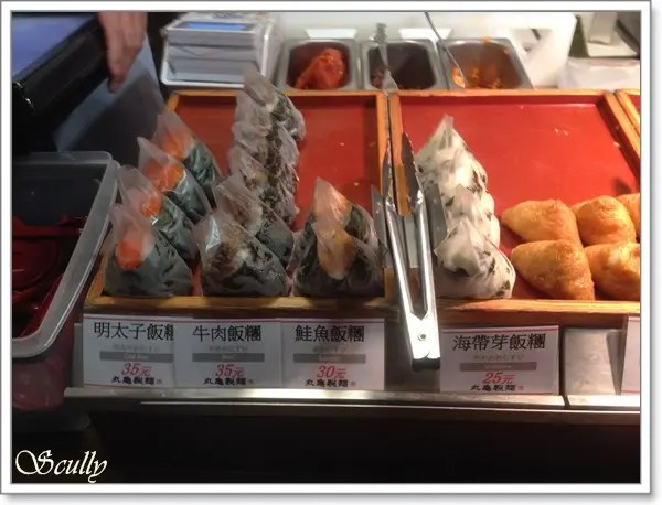 明太子飯糰$35、牛肉飯糰$35、鮭魚飯糰$30