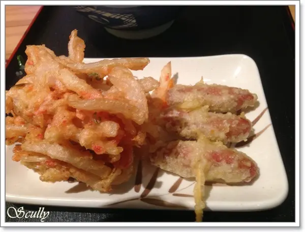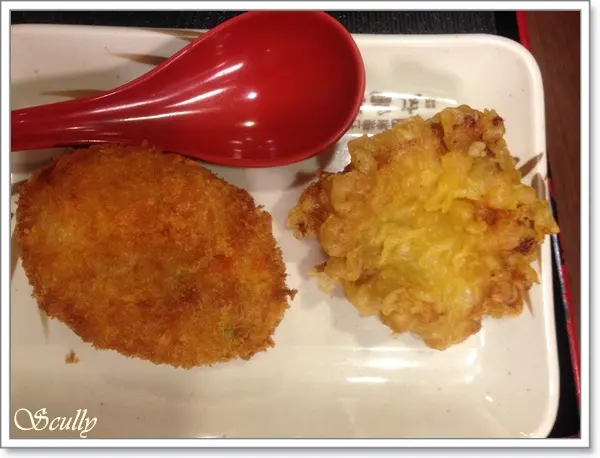烏龍麵有點半透明的,相當Q彈而且還會裹湯汁,吸一下全都划入口中,清爽有嚼勁,挺不錯的~原豚骨湯滿濃郁的但較油,柴魚湯較清爽,都挺鹹的,但加上天婦羅花後湯頭變得層次更豐富好好喝但也會變得更油膩,無法多喝~