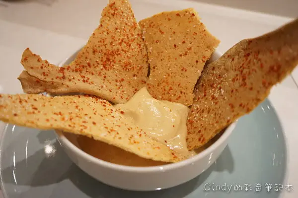 烤得很脆的麵包 沾上奶油花生醬 鹹甜鹹甜的滋味還滿有趣的~